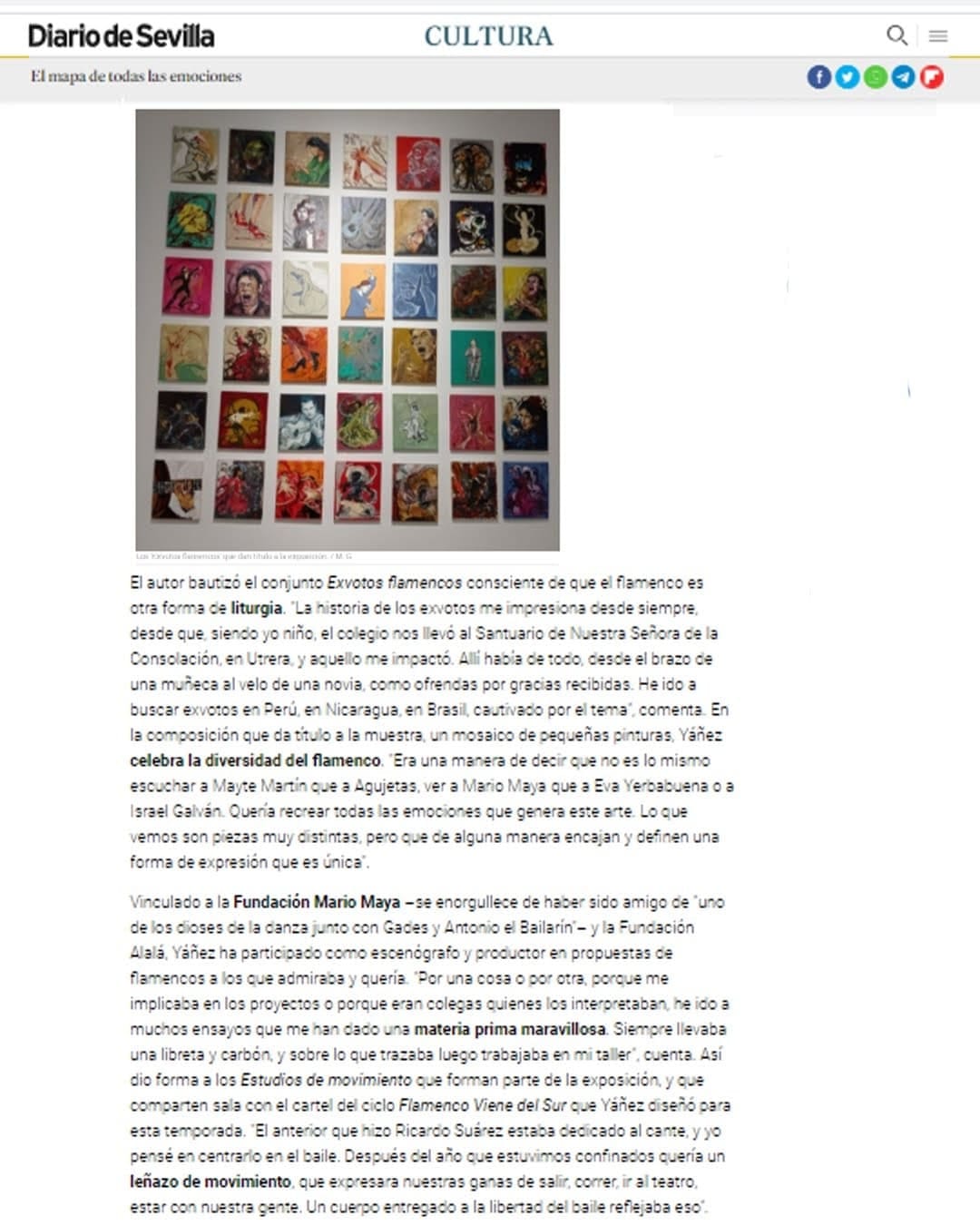 Yáñez ajusta cuentas con esa afición en Exvotos flamencos, una muestra que acoge la sede del Instituto Andaluz del Flamenco (IAF) hasta principios de enero (de lunes a viernes, de 8:30 a 15:00) y en la que plasma, con una paleta colorista y vibrante, el torbellino de sentimientos que este arte aviva en quien lo observa. En Donde habita la danza, una de las series que recoge la exposición, el pintor no se afana tanto en recoger el movimiento de los bailaores como "el trazo que los cuerpos dejan en el aire, atrapar lo que queda después, esa emoción". Ese aura que se les escapa a los intérpretes en plena actuación, ese misterio fugaz que sacude a los espectadores sensibles, se vuelve aquí materia perdurable. Cristóbal Ortega, director del IAF, señala una feliz paradoja: gracias a la alquimia de Yáñez con los pinceles, el flamenco trasciende su condición efímera, se mantiene en el tiempo; el movimiento permanece así inamovible.